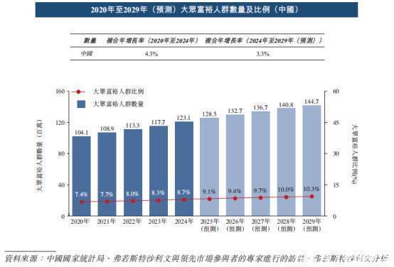数据显示,2020 年至 2024 年,私立医疗服务机构的付费患者就诊人数以 8.1% 的复合年增长率快速增长,预计到 2029 年将达到 19.876 亿人次;中国大众富裕人群数量至 2024 年已达 1.231 亿人,预计 2029 年将达 1.447 亿人,比例亦从 8.7% 增长至约 10.3%。